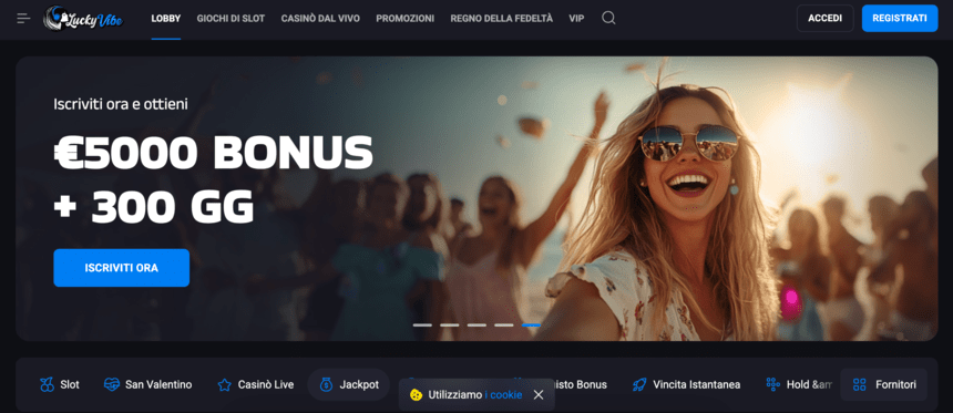 LuckyVibe è un casino online non AAMS moderno e dinamico, progettato per offrire un’esperienza di gioco coinvolgente con oltre 2.000 giochi di alta qualità. Che tu sia un amante delle slot o del casinò dal vivo, troverai sempre qualcosa di entusiasmante da giocare. Con transazioni veloci, un’interfaccia intuitiva e un pacchetto di benvenuto generoso, Lucky Vibe è una destinazione ideale per i giocatori online.