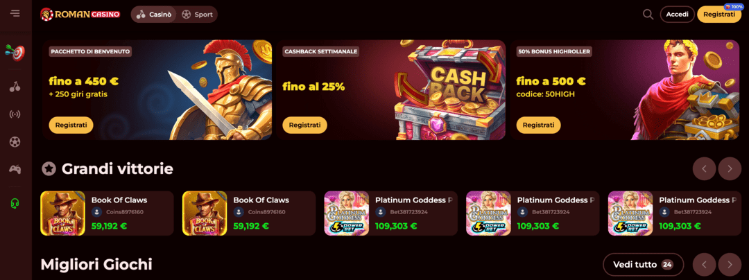 Rollero Casino è un casino no AAMS innovativo, progettato per offrire un’esperienza di gioco fluida e accessibile. Grazie a un’interfaccia accattivante, una compatibilità mobile ottimale e un’ampia selezione di giochi, questo casino online garantisce un’esperienza coinvolgente per ogni tipo di giocatore. Che tu preferisca le slot, i giochi con croupier dal vivo o le scommesse sportive, Rollero Casino ti assicura un viaggio emozionante e senza intoppi.